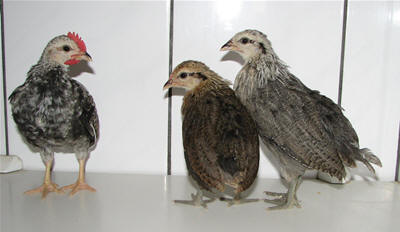 Links zilverpatrijs haantje, midden geelpatrijs hennetje en rechts een zilverpatrijs hennetje.