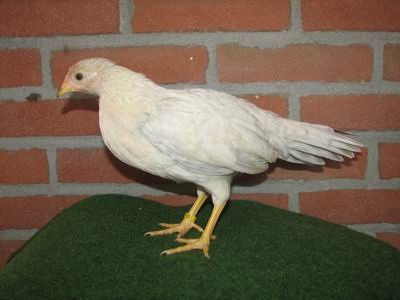 Het bruin in de vleugeldriehoek van de haan is vervangen door crème. De borst van de hen is licht zalmkleurig.